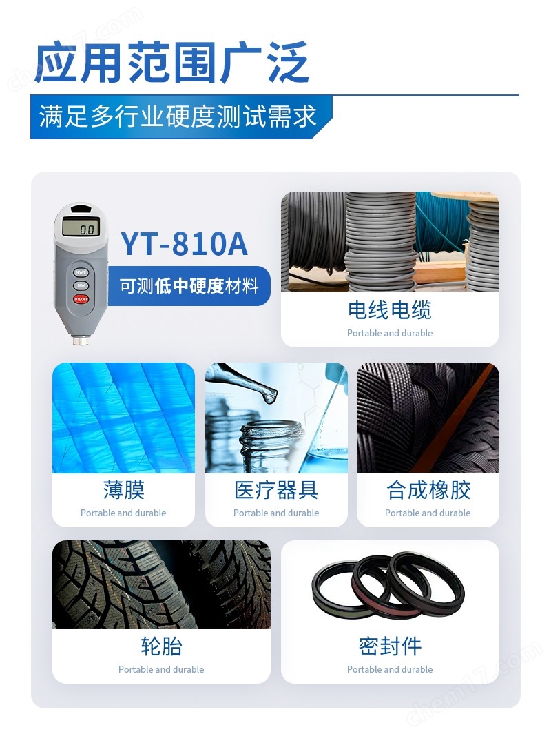 ● 適用范圍廣:塑料(如薄膜、醫(yī)療器具等)、合成橡膠(如密封件、輪胎、膠輥、膠管/帶、電線電纜、減振器等)及其它相關(guān)化工制品的硬度測量;