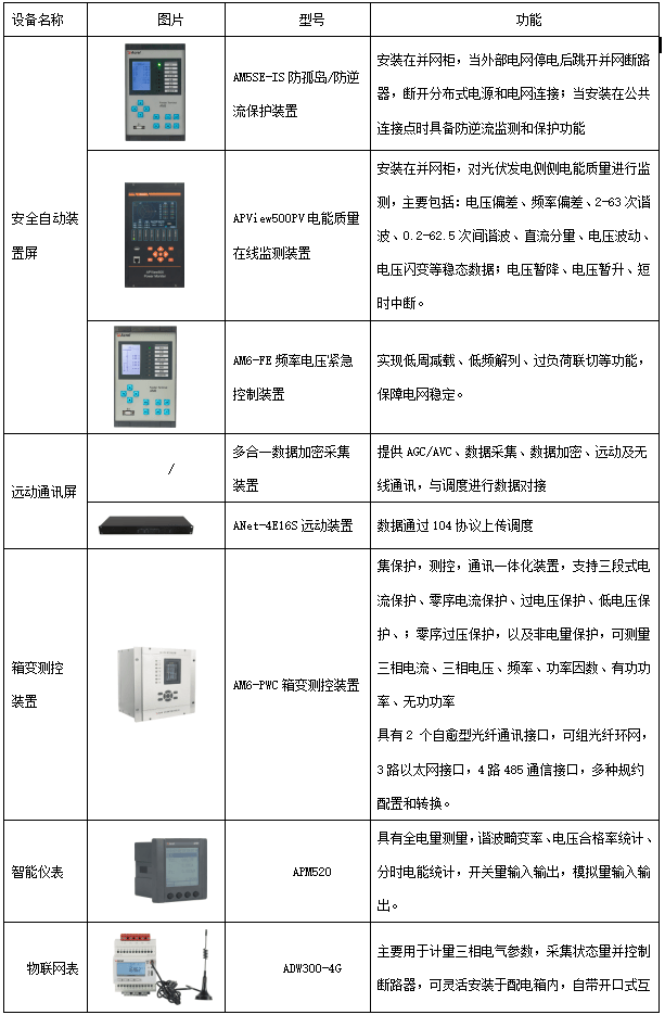 光伏、儲能監(jiān)控系統(tǒng)需要使用相關(guān)保護(hù)、測控、穩(wěn)控、分析及數(shù)據(jù)安全和通訊設(shè)備,典型的分布式光伏、儲能電站并網(wǎng)系統(tǒng)需要用到的二次設(shè)備如下表所示: