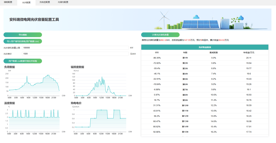 軟件基于當(dāng)?shù)毓庹召Y源與園區(qū)負(fù)荷歷史用電情況,自動推薦裝機(jī)容量,評估自發(fā)自用比例與發(fā)電收益。